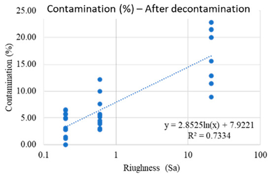 The result shows that as the roughness increases, the number of bacteria that remain on the surface after decontamination treatments are higher and scale with a linear trend. However, the high variability of the data should be highlighted (which translates into an R2 that is not very high, but still significant).