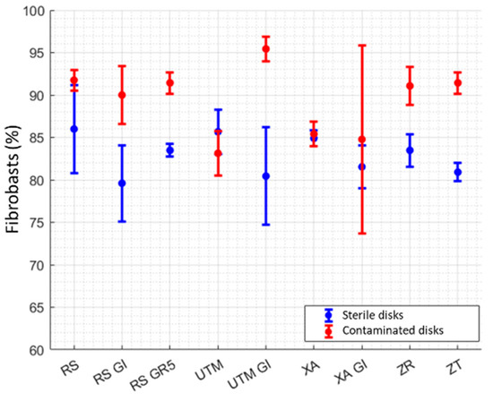 Regarding the growth of fibroblasts, both in the case of sterile and decontaminated discs, the results are not statistically influenced by either roughness or wettability (Figure 5). In Scheme 5, it is possible to observe the percentages of fibroblasts on sterile and decontaminated discs. The results of the t-tests are shown in Table 6, with the surfaces with significant differences highlighted (alpha = 0.05).