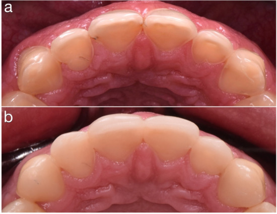 (a) Palatal surfaces before restorations were done. (b) Palatal direct composites.