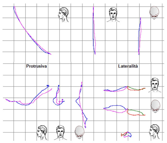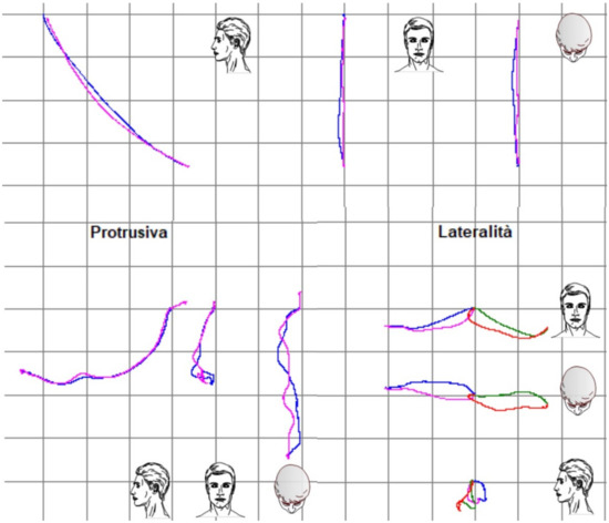 The functional evaluation of TMJ was initiated with the screening questionnaire from the Diagnostic Criteria for Temporomandibular Disorders (DC/TMD) [17]. The questionnaire resulted in negative and dysfunctional pathologies of the stomatognathic system being excluded. In fact, the patient did not refer to pain at extrusive movements, nor were there any clicking, tripping noises, or crepitus found. Functional analysis was completed using the Kinesiography system (BIO-key; Bioket, San Benedetto del Tronto, Italy), which helped us analyze the jaw cinematically during opening protrusive and lateral movements [18,19].