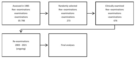 In 1985, the late professor Per-Östen Söder started a cohort study at the Karolinska Institutet in Stockholm, Sweden (Figure 1). The subjects of the cohort were selected using the registry file of all of the inhabitants of the Stockholm metropolitan area and consisted of 3273 adults aged between 30 and 40 years and born on the 20th of any month between 1945 and 1954. This sample represented >100,000 inhabitants of the Stockholm area in the age group in question. In total, 1676 members of the cohort, 838 men and 838 women, agreed to participate and underwent an initial clinical dental examination in 1985–1986. The database is unique, now with a follow-up of over 30 years. Namely, in Sweden, all of the inhabitants have a unique code of identification and there are national cumulative population and disease registers. Thus, each subject´s life span can be followed up until death. In the series of studies described here, the following registers of the National Board of Health have been used in the analyses: social-economic register, open ward register, hospital register, dental treatment register, medication register, cancer register and death register (Table 1). Consequently, the disease burden of the subjects could be analyzed in view of their baseline oral health data. For example, the cumulative systemic disease burden of the patients with and without baseline periodontitis can now be followed up for more than 30 years through the registers. “Periodontitis” diagnosis in 1985 was based on measuring gingival pockets from 6 sites of each tooth to the nearest mm with a standard periodontal probe with pocket depth ≥5 mm used as unit in the analyses [1]. Outcomes such as prevalence of cardiovascular diseases or cancer at certain time points were observed during course of the investigation [2,3]. The following paragraphs present the results so far obtained from the Stockholm Study. The project is ongoing, and the profile of the cohort study is presented in Figure 2.