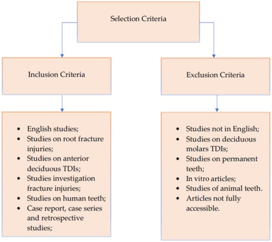 (1) Population. We exclusively considered studies carried out on patients with primary dentition with one or more injured teeth in the incisal group affected by root fracture and/or dislocation (intrusive, extrusive, or lateral). Furthermore, we excluded root fractures of the deciduous molars.