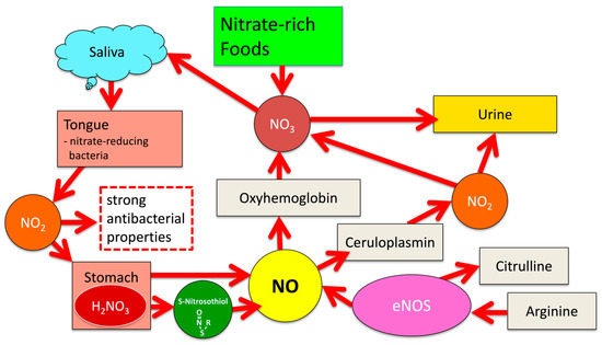 - Lundberg, J.O.; Weitzberg, E.; Gladwin, M.T. The nitrate-nitrite-nitric oxide pathway in physiology and therapeutics. Nat. Rev. Drug Discov. 2008, 7, 156–167. [Google Scholar] [CrossRef]