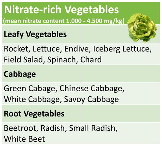 Nitrate-rich vegetables include many popular varieties such as lettuce, rocket, chard and spinach, cabbage, radish or beetroot (see Figure 2). The actual nitrate content of an individual plant does not only depend on the variety. It is decisively influenced by the amount of fertilization, seasonal and geographical parameters and the time of harvest within a day [49]. The latter reflects the fact that in photosynthesis, sunlight is not only the main source of energy for the reduction in carbon dioxide but also for the reduction in inorganic NO3 taken up from the soil [50]; therefore, NO3 accumulates in the plant during the night and is consumed again during the day by photosynthesis. This makes it very difficult or impossible for agricultural producers to predictably standardize the NO3 content of harvested vegetables within a narrow range. Furthermore, cooking or frying may noticeably change the initial nitrate content of raw, unprocessed vegetables [51]. The amount of NO3 ingested with the consumption of unprocessed vegetables can therefore only be roughly estimated with the help of comparison tables [49]. A more accurate monitoring of NO3 intake requires either the consumption of processed vegetable products with a defined NO3 content, as in the study by Jockel-Schneider et al. [38], or the direct measurement of salivary NO2 levels, which increase after nitrate-rich meals due to the metabolic activity of the nitrate-reducing oral microbiota. This can most easily be achieved with specific, commercially available test strips, which have become popular among athletes, as a nitrate-rich diet can significantly increase endurance and high-intensity performance by improving coronary and muscular blood flow [52,53].