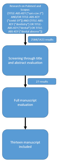 The “Preferred Reporting Items for Systematic Reviews and Meta-Analyses-PRISMA” checklist was used as a guideline. A systematic scoping review of the present scientific literature was performed during 04/2022 on research engines SCOPUSand PubMed. Research query was: (TITLE-ABS-KEY (“SARS-COV-2”) AND/OR TITLE-ABS-KEY (“COVID-19”)) AND (TITLE-ABS-KEY (“dentistry”) OR TITLE-ABS-KEY (“dental”) OR TITLE-ABS-KEY (“dental abscess”)), designed to be as comprehensive as possible. A first selection was performed through title and abstract analysis (performed by all authors); out of topic papers and/or title/abstract not in English were discarded. Full-text evaluation of the remaining articles was then performed. The excluding criteria were: