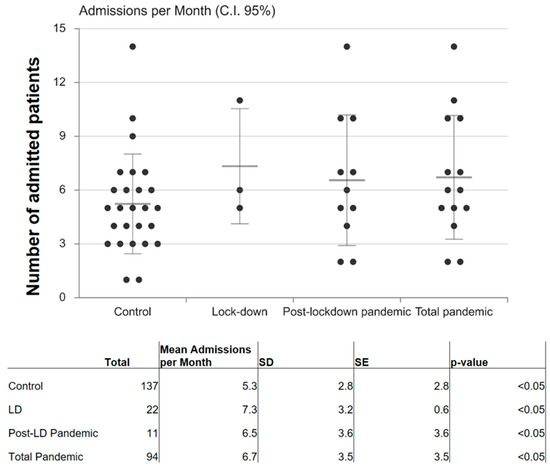 Dot plot of numbers of admissions per month; 95% confidence interval; p < 0.05. CI: confidence interval; SD: standard deviation; SE: standard error.