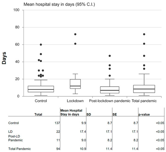 Box plot of hospital stay in days; 95% confidence interval; p < 0.05. CI: confidence interval; SD: standard deviation; SE: standard error.