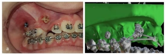 Figure 1a,b). The area of the mini-implants placement (mostly buccally between first and second molar or second premolar), the inclination to the occlusal plane and the point of insertion were selected upon treatment goals.
