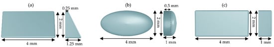 Dimensions of the (a) rectangular beveled attachment, (b) ellipsoid attachment, and (c) horizontal rectangular attachment [9].