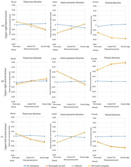 Nodal displacement results: (a) upper right lateral incisor, (b) upper right central incisor, and (c) upper left central incisor.