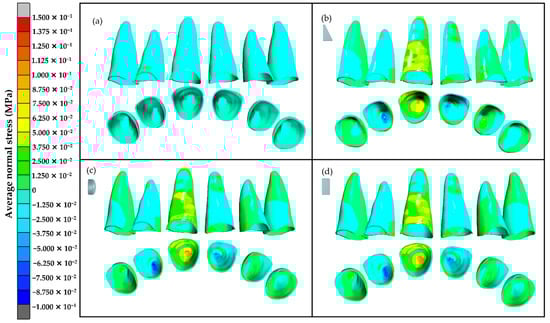 Distribution of the average normal stress at the upper anterior teeth PDL: (a) no composite attachment, (b) rectangular beveled attachment, (c) ellipsoid attachment, and (d) horizontal rectangular attachment.