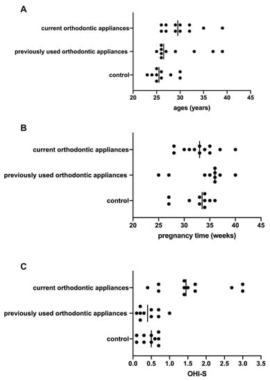 The average stage of pregnancy for women who had never used orthodontic appliances (control) was 32.4 ± 3.2 weeks; for those who had previously used orthodontic appliances, it was 34.2 ± 4.6 weeks; and for those with current orthodontic appliances, it was 33.0 ± 3.5 weeks (Figure 1B).