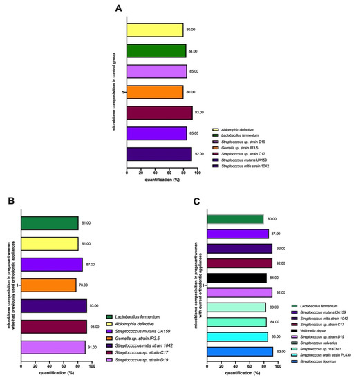 qPCR results of the similarities in the bacteria in the oral microbiomes of pregnant women who had never used orthodontic appliances (control) (A); pregnant women who had previously used orthodontic appliances (B); and pregnant women with current orthodontic appliances (C).