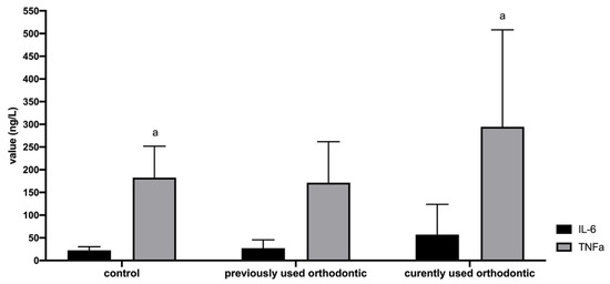 IL-6 is a multifunctional cytokine that plays an important role in acute and chronic inflammation and autoimmunity. In relation to orthodontic treatment, IL-6 plays an important role in the movement of teeth, namely the inflammatory process that supports the resorptions process in apical areas [12,13]. Increased IL-6 levels occur not only in periodontal or alveolar tissues but also in saliva [14]. Similar to IL-6, TNF-α is also affected by orthodontic treatment and plays a role in the processes of tooth movement and bone resorption [15]. Orthodontic treatment increases TNF-α levels in periodontal tissue, especially in gingival crevicular fluid [16]. With the inclusion of various inflammatory markers such as cytokines, namely TNF-α and IL-6, it also affects the hygiene and oral composition of the microbiome [17].
