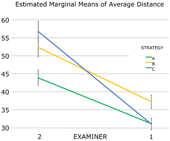 The General Linear Model demonstrated that the mean value of the absolute distances depends on three factors: the examiner, the strategy, and the repeat. In addition, there was a positive correlation between the examiner and the strategy (Table 3 and Table 4).