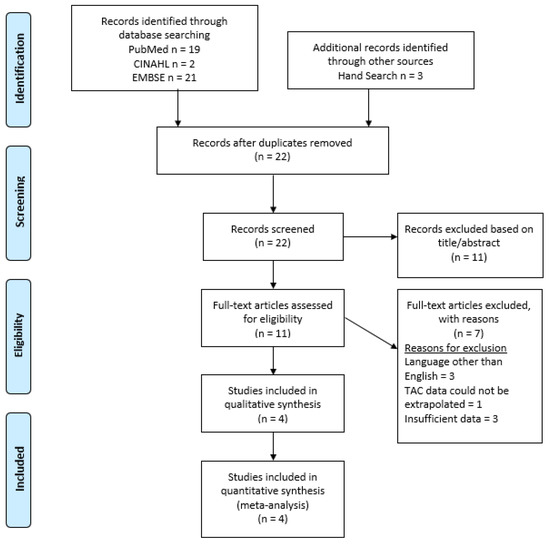 A total of 42 articles were retrieved from the databases with an additional 3 articles found with hand searching and cross-referencing. After duplicates were removed, 22 articles remained. The abstracts and titles were reviewed to establish inclusion to review full-text articles. Of the 22 reviewed, 11 articles were discarded as they clearly did not meet the criteria. The full texts of the remaining 11 articles were reviewed for inclusion. Upon review of the full texts, an additional 7 were removed due to the following reasons: (a) no English version available (n = 3), (b) data did not include overall TAC and could not be extrapolated (n = 1), and (c) data insufficient to be included for analysis (n = 3). The remaining four articles were carefully evaluated and included in the meta-analysis [13,14,15,16]. All studies excluded third molars from their TAC analysis; therefore, third molars were also removed from the TAC analysis for the unpublished TAC data. The Prisma diagram can be found in Figure 1.