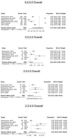 The heterogeneity (I2) across the studies ranged from 0 to 99%. Subjects with no agenesis (0.0.0.0) comprised 97.1% of the combined control subjects and 51.6% of the combined subjects with OFC. A total of 31 TAC patterns, including no agenesis, from all studies combined were identified (Table 3). The most common TAC patterns seen in the combined groups were 0.2.0.0 (agenesis of tooth #22) (3.8%), 2.0.0.0 (agenesis of tooth #12) (3.1%), and 2.2.0.0 (agenesis of #12, 22) (2.9%). When broken down by case (OFC) and control, respectively, the most common TAC patterns for agenesis were 0.2.0.0 (9.7%/0.3%), 2.0.0.0 (7.1%/0.3%), 2.2.0.0 (6.6%/0.3%), and 0.16.0.0 (1.2%/0.1%). In examining the OFC1 dataset alone, which is the only dataset with both controls and cases, we found that subjects with OFC have statistically significant greater odds of having a TAC pattern with agenesis (p < 2.0 × 10−16). The results also suggest that subjects with OFC have statistically significant greater odds of having the following agenesis patterns: 0.2.0.0 (p = 1.3 × 10−15), 2.2.0.0 (1.2 × 10−14), and 2.0.0.0 (p = 3.3 × 10−11) (Table 4). TAC patterns including posterior teeth were not found to be significantly different between cases and controls overall or by cleft type. Therefore, the rate of posterior TA in OFC is consistent with that of controls and may indicate that OFC-related TA primarily affects the maxillary anterior teeth. Forest plots for the most common TAC patterns seen can be found in Figure 2.