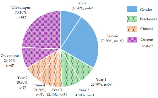 Figure 1 shows sociodemographic background of the respondents. A total of 249 Kulliyyah of Dentistry (KOD), IIUM students (69 males, 180 females) answered the online questionnaire, representing a response rate of 85.3%. From the respondents, 47.4% (n = 118) were preclinical students consisting of Year 1 and 2 students and 52.6% (n = 131) were clinical students consisting of Year 3, 4, and 5 students.