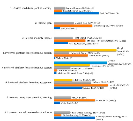 Based on Figure 2, the majority of KOD students answering the questionnaire used both laptop/desktop computers and smartphones/tablets for their online learning and preferred subscribing to unlimited internet plans. Almost half (49%, n = 122) of the students belonged to the M40 socioeconomic group (parents’ monthly income that ranged from RM 4890 to RM 10,959). For synchronous learning sessions, students preferred using Google Meet, followed by Zoom. Meanwhile, for asynchronous sessions, students preferred pre-recorded learning sessions to be shared via Google Classroom, followed by Telegram and WhatsApp. Most students preferred their assessments to be conducted via Google form. More than half of the students spent an average of 5–10 h per day in online classes and self-study. Finally, 64.3% (n = 160) of the students preferred hybrid learning methods instead of online learning alone after the pandemic.