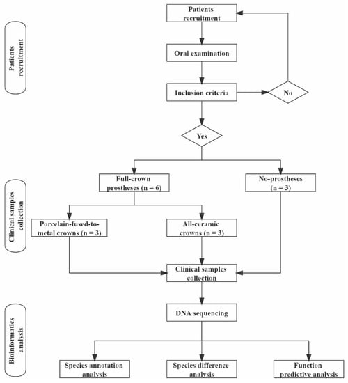 Oral examinations were performed on the patients to assess the number of remaining teeth in the mouth, the caries status (DMFT), and the periodontal status (gingival bleeding, periodontal pockets, loss of attachment). The eligible patients were selected according to our inclusion and exclusion criteria. Then, we collected plaque samples of full crowns 3–6 months after restoration treatment in the groups porcelain-fused-to-metal crowns and all-ceramic crowns. Moreover, plaque samples from the teeth adjacent to the defected teeth were collected in the no-prosthesis group. Plaque samples were collected by wiping the surface of the prostheses and teeth with a cotton swab for 10 s. All collected samples were stored with PBS buffer (pH = 7.4) in an enzyme-free EP tube and frozen in a −80 °C refrigerator.