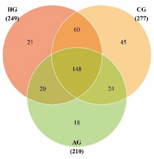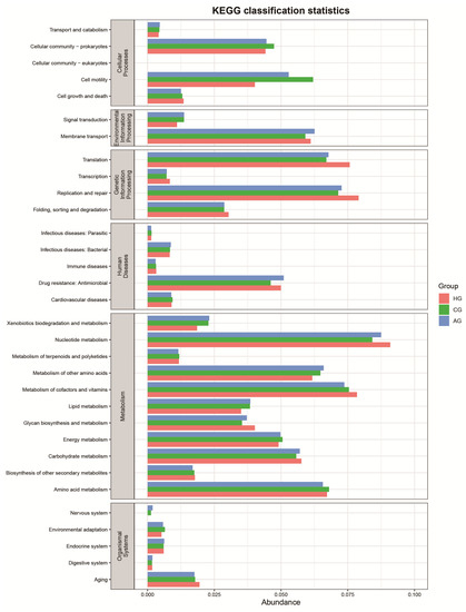 The VennDiagram package in R software was used to draw a Venn diagram for counting the number of common or unique OTU among different samples (groups). The ggplot2 package in R software was used to draw the histogram of the relative abundance of species and then select the species ranked top 30 to perform the similarity clustering of the relative abundance, which was shown with a heat map drawn with the pheatmap package in R software [23]. LEfSe software was used to perform a linear discriminant analysis (LDA) on the taxa with significant differences in abundance, and a Metastats analysis was used to detect species differences at the phylum and genus levels, so as to find the species with significant differences in sample classification [24]. PICRUSt2 (Phylogenetic Investigation of Communities by Reconstruction of Unobserved States) is software that predicts the functional abundance of a sample based on the abundance of the marker-gene sequences in the sample; this was used to predict the functions of the microbial community in each group [25].
