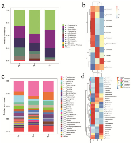Histogram of species abundance at phylum (a) and genus (c) levels and heat map of species abundance at phylum (b) and genus (d) levels.