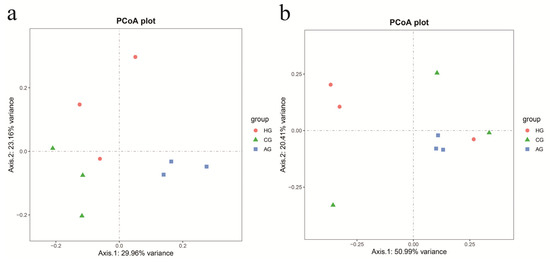 Beta-diversity analysis of the samples performed using the Principal Co-ordinates Analysis based on the unweighted Unifrac distance (a) and the weighted Unifrac distance (b). The more similar the community composition of the samples was, the closer their distance in the PCoA diagram is.