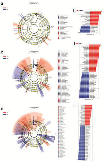 Species-difference analysis of different groups. (a,c,e) Colors represent different groups. The red nodes in the branches represent microbial groups that play an important role in the red groups, and the green nodes represent microbial groups that play an important role in the green groups. Yellow nodes represent microbial taxa that did not play a significant role in either group. (b,d,f) The LDA value distribution diagram of the different species, the LDA value distribution histogram shows the species whose LDA Score is greater than the set value (the default setting is 2), that is, the Biomarker with statistical difference between groups. The length of the histogram represents the effect size of the different species.
