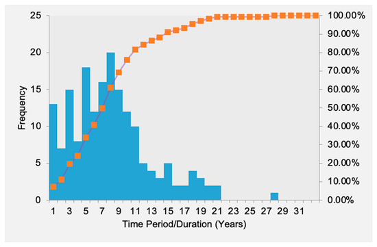 Time periods between implant placement and time of consultation. Blue bars indicate absolute number of patients, and line indicates cumulative percentages in corresponding time horizon (years; X-axis).