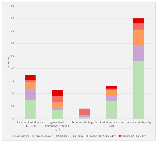 Smoking status according to patient data based on periodontitis manifestation (number: number of patients). Cig: cigarettes.
