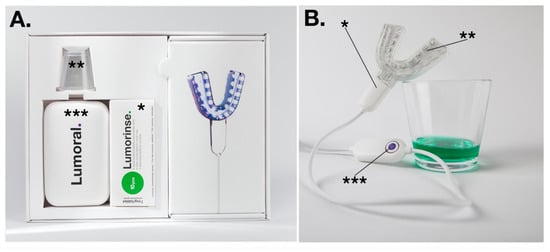 The dual-light aPDT device. (A) The packaging includes the effervescent ICG tablets (*) to be dissolved in 30 mL of water, for which a measuring cup (**) is available. A power source (***) provides electricity for the mouthguard-type light applicator. (B) The mouthpiece (*) is composed of 48 LED components (**) able to provide simultaneous 405 nm and 810 nm light. Symmetrically assembled LEDs provided light for both maxillary and mandibular dental arch. The button on the control unit provided a treatment time of 10 min (***). The glass contains dissolved mouth rinse.