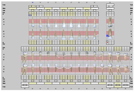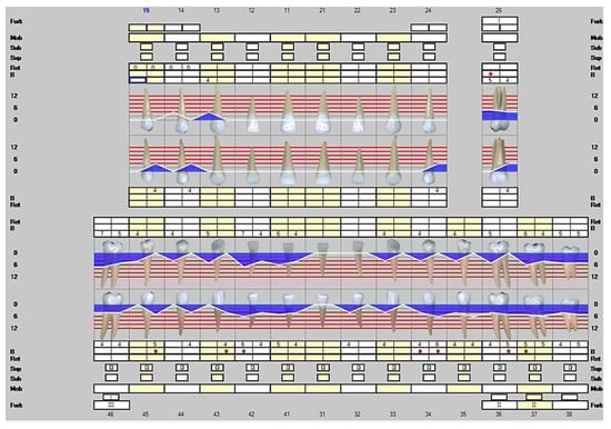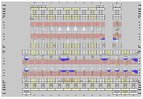 Representation of the clinical situation on 26 April 2021. The white line describes the clinical attachment level and the blue color infected periodontal pockets. The red dots represent a positive result in bleeding on probing.