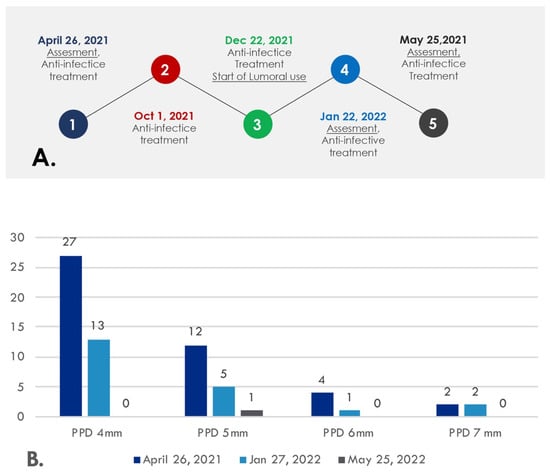 (A) The timeline of the patient visits to the clinic. (B) The number of periodontal pocket depths (PPD)s of 4 mm, 5 mm, 6 mm, and 7 mm measured at the beginning of the study (26 April 2021) and during aPDT use at the maintenance visits (27 January 2022 and 25 May 2022).