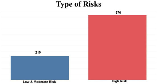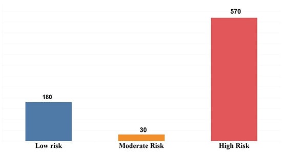 This dataset consists of 780 records and 17 variables. One of the variables is classified with three values, namely, Low, Moderate, and High Risk. According to Table 1, it is clear that all variables are categorical. The contribution of each variable is represented by the number and percentage for every value. Two experiments were carried out using the dataset. The dataset in the first experiment was divided into three different groups: 180 Low Risk, 30 Moderate Risk, and 570 High Risk. In the second experiment, the dataset was divided into two groups: 210 Low and Moderate Risk, and 570 High Risk. Figure 1 and Figure 2 show the distribution of risks in the first and second experiments.