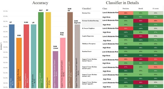 These data are modelled in seven different ways. It should be noted that the Support Vector Machine algorithm is modelled with four different kernels. The Leave-One-Out method is used to evaluate them. For this purpose, the accuracy parameter is considered for the evaluation of the results. Since this variable does not represent the results correctly, it is necessary to consider other variables as well. Three variables, precision, recall, and F1-score, were used to better evaluate the performance of the machine learning algorithms. According to the accuracy, EGB Multilayer Perceptron and Random Forest have the best results, with 97.4%, while the Support Vector Machine with linear kernel has the worst results, with 93.6%. Figure 3 shows the accuracy for the ten different models used for this study.