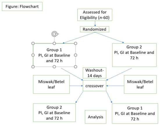 This crossover randomized single-blinded pilot study was conducted with a 20-day total examination period. The participants were informed in detail, and a signed agreement was acquired. A sample size of 60 patients with gingivitis (Score 1 in Gingival index; Loe and Sillness) was selected. Randomization was done by drawing lots into either test 1 (Dabur miswak, India) or test 2 (Betel leaf—Bentodent, India). To achieve blinding, serial opaque cardboard boxes with pre-assigned numbers corresponding to the lot randomization code were utilized to assign participants to their appropriate groups. After being assigned to their respective groups, the participants were blinded. On the first (baseline) day of the trial, all individuals were subjected to an oral examination. The baseline score was obtained for patients who met the inclusion criteria at the beginning of the study and followed-up throughout the study (