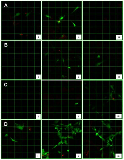 Images captured under a confocal fluorescence microscope (CFM); n = 3 (i, ii, iii). (A). HAp-egg shell/PLGA + HPdLF. (B). HAp-egg shell/PLGA + HPdLF + Collagen. (C). HAp-egg shell/PLGA + HPdLF + PRF. (D). HAp-egg shell/PLGA + HPdLF + PRF + Collagen. Live cells are green, dead cells are red.