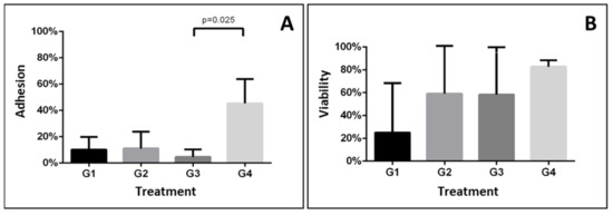 One-way ANOVA with Bonferroni post-hoc test revealed that the cell adhesion percentage was significantly different in group 4 with respect to the other groups (p = 0.015). In contrast, no statistically significant differences were observed for cell viability among the evaluated groups (p = 0.474).