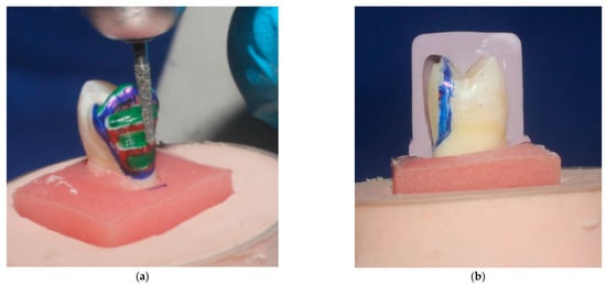 The accuracy of tooth reduction can be controlled by different clinical methods including silicone index and depth limiting burs [,]. In this in-vitro study, all teeth received a standardized buccal reduction utilizing the diamond depth cutter burs (Ceramic Veneer Set, Komet, Germany) to ensure equal reduction of approximately 0.4 mm depth cervically was obtained, as the thickness of the enamel in the cervical area of the teeth does not allow preparation of 0.5 mm without exposing the dentin, and 0.5 mm on the occlusal two thirds. Such reduction depths were made to ensure that the whole preparation was within the enamel [,,]. At the occlusal surface, cuspal reduction was conducted to maintain a low stress concentration in comparison to the occlusal preparation without cuspal reduction, in which the buccal cusp reduction was 1.5 mm occlusio-cervically and 1.5 mm from the tip of the cusp palatally placing the veneer margins out of the contact and grooves occlusally [,].