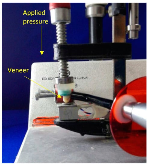After cleaning and etching of all the prepared teeth, Single Bond Universal Adhesive (3M ESPE, Seefeld, USA) was applied to the prepared teeth and to the silanized surface of the veneers. The cementation was made with 3M RelyX veneer resin cement (3M ESPE, Seefeld, Germany). After the application of the resin cement on the internal surface of the veneers, these veneers were seated in occluso-cervical direction on the prepared teeth with the help of Optrastick (Ivoclar Vivadent/clinical, Germany) under light pressure. The positioning pressure was controlled by a custom-made cementation device at 1 kg [,] (Figure 3).