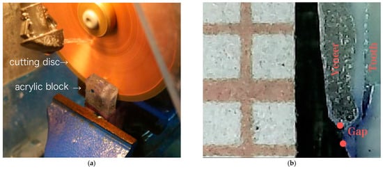 In this study, the evaluation of marginal fit was conducted by measuring the maximum distance between the finishing point of the underlying prepared tooth and the margin of the ceramic laminate veneer on the cervical margin directly through vertical sectioning procedure, which is an extremely advantageous tool that helps in reducing the chances of software and repositioning errors and permits an undisturbed view of the marginal gap (Figure 4). In order to reduce the chances of specimens’ destruction during the sectioning procedure, acrylic resin was used, into which the specimens were embedded [,,,,].