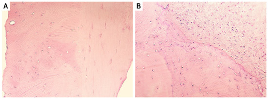 In the bone tissue, MMP-2 is overexpressed and promotes mineralization of the bone, whilst osteoclast-secreted MMP-9 is responsible for bone resorption and altering the bone strength [18,19]. However, in the later stages, MMP-9 has been postulated to be expressed by the inflammatory cells [18] and to prevent the accumulation of hypertrophic chondrocytes [20]. In knockout mouse models, a lack of MMP-9 has been associated with delayed bone vascularization, the ossification of hypertrophic cartilage, and the formation of more brittle bones [21,22]. Additionally, it has been shown that CD34+ endotheliocytes are present along the cartilage–bone junction and accelerate the calcification and formation of bony TMJA [10]. Another study also reported the presence of aberrant cartilage that was characterized by hypertrophic chondrocyte-like cells at the bone/cartilage interface [13]. In our study, we found that the expression of both MMP-2 and MMP-9 was strong in the primary surgery tissue but was reduced in the repeated surgery material. Increased expression in the primary surgery tissue could indicate their role in the promotion of the ossification of the TMJ and joint cartilage, whilst a reduced expression in the repeated surgery tissue could be indicative of acceleration of the collagenization process in the TMJ. In both cases, there seems to be a disbalance in the expression patterns of both these MMPs.