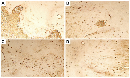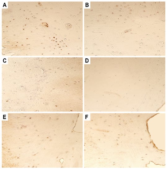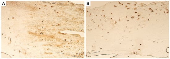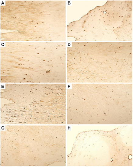 In regard to the cytokines, the expression of IL-1 was also found to be stable with moderate number of osteocytes and chondrocytes positive in both primary and repeated surgery material (Figure 4E,F). The expression of TNF-α was found to be stronger in the primary surgery material, with moderate to numerous cells showing immunopositivity. However, in the repeated surgery material, only few TNF-α-positive were visualized (Figure 4G,H).