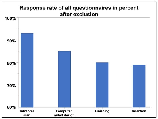 The following supporting information can be downloaded at: https://www.mdpi.com/article/10.3390/dj11010005/s1, Supplement S1 (Document): Questionnaire in German (study questionnaire in original layout (German). The length of the visual analog scale is 100 mm, and it was measured with a caliper for the analysis (left pole: 0; right pole: 100)). Supplement S2 (Document): Questionnaire in English (translation of the study questionnaire with details of the question type (visual analogue scale (VAS); multiple choice (MC) or single choice (SC)). For MC and SC questions with the indication of eligible items, VAS with the facing poles presentation.) Supplement S3 (Document): (Manual ExoCad VALETTA splint design 2.2.pdf (step-by-step instructions for the CAD of the occlusal splints with settings and used parameters (German).)). Supplement S4 (Video): Video Exocad Valetta 2.2 splint design (screencast according to the procedure described in the step-by-step CAD instruction). Supplement S5 (Table): Discarded questions (overview of discarded questions by questionnaire and reason). (indication of the number of excluded questions, sorted by questionnaire and reason: no ID indicated on the questionnaire (no ID); the same ID indicated several times within a questionnaire and keeping the questionnaire with the earliest date (only one dataset kept); the same ID indicated several times within a questionnaire without date indications, so no questionnaire was kept (no dataset to keep); the total number of excluded questionnaires by questionnaire and reason (sum discarded)). Supplement S6 (Table): Table with an overview of all VAS responses (results of all visual analogue scales with the indication of question and facing poles (VAS 0; VAS 100); 25th and 75th percentiles, median, standard deviation (SD), and number of responses (N)). Supplement S7 (Table): MC SC questions (results of all multiple choice (MC) and single choice (SC) questions with the indication of the items, number of answers per item (N), and frequency distribution in percentage. The questions marked with an asterisk (*) show the summary of an item with the breakdown of its additional statements). Supplement S8 (Table): Comparing the mean values of responses to time-relevant items in each cohort (the cohorts (x-axis) and values of items scale are described by the least squares mean values (y-axis) with standard deviations (blue bars) and the mean of means (horizontal dotted line)). Supplement S9 (Table): Comparison of mean values of VAS and duration by impression method preference (comparison of mean values of VAS and duration by using the impression method preference for effort (sensation and time) to produce an equilibrated bite splint and to evaluate the initial fit and finished workpiece).