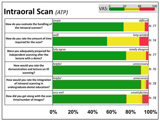 The overall workflow with scanning, designing, finishing, and inserting the splints (N = 58) was predominantly rated very good to satisfactory (79%) by most participants (Supplement S7). Concerning the training for dental professions, the participants evaluated the practice and implementation of the intraoral scan in the curriculum as helpful for later daily practice (Supplement S6).