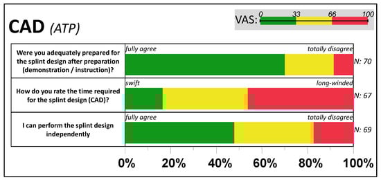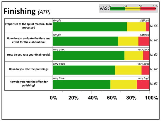 Following Figure 5, manually machining the additively manufactured splint material was rated by over 60% as “simple” (VAS < 33), with usual handling accompanied by “low efforts” in polishing (aside from five polishing problems), leading to a primarily good final result (VAS < 33) in 7 out of 10 cases. Problems occurred in hand with shortcomings in CAD design (N = 4), problems with the fit (N = 9), one visible deformation, and doubtful rating of mechanical stability (N = 6).