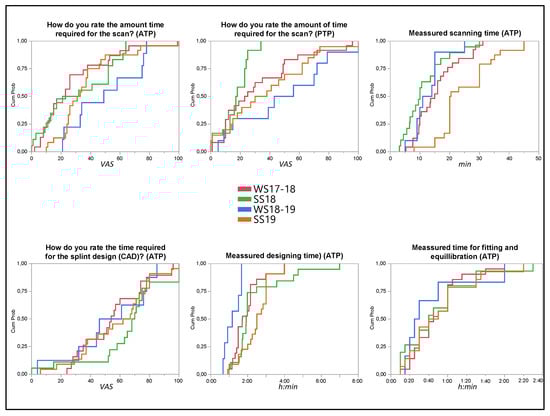 The WS18-19 showed a statistically significant (REML) shorter measured duration for the digital construction of the splint compared to SS18 (p < 0.01) and SS19 (p < 0.01). However, the perceived duration for the splint’s design during the semester was nearly equivalent (p > 0.3). The time required to fit and equilibrate the splint in Task 4 shows very similar values for all semesters and no significant deviations (p > 0.7).
