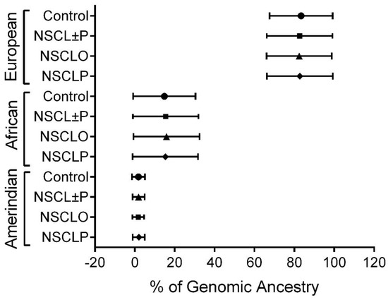 Genomic ancestry proportions from the groups of patients with nonsyndromic cleft lip with or without cleft palate (NSCL±P), nonsyndromic cleft lip only (NSCLO) and nonsyndromic cleft lip and palate (NSCLP) and control. Circle was designed to control group, square to NSCL±P, triangle to NSCLO and diamond to NSCLP.