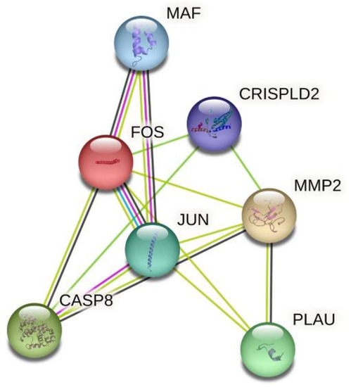 Pairwise SNP-SNP interactions among FOS, CASP8, MMP2 and CRISPLD2 (rs1546124, rs8061351, rs2326398 and rs4783099) were performed using the model-based multifactor dimensionality reduction (mbmdr) test (mbmdr package for R) adjusted by sex and genomic ancestry and applying cross-validation and 1000 permutation strategies to reject false-positive interactions [19]. STRING, the protein-protein interaction network software, was applied to investigate the functional interactions among the examined genes (https://string-db.org/, accessed on 13 December 2022).