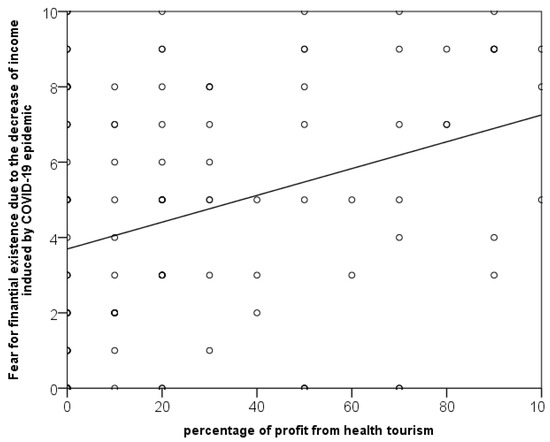 Scatter plot presenting the association of profit from health tourism with fear of financial existence due to the COVID-19 pandemic, with the line demonstrating a linear trend.
